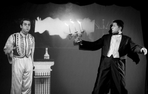 他的魔術(shù),每次都能迷惑所有人,因?yàn)闊o(wú)論怎樣,這都像兩個(gè)人“打配合”的表演:希臘魔術(shù)師、國(guó)際魔術(shù)界公認(rèn)最好的電影魔術(shù)大師喬哥斯,在幕布做成的鏡子前,捧出一個(gè)小瓶子。裊裊煙霧中,一個(gè)古裝魔術(shù)師從瓶中鉆出,如阿拉丁神燈的傳奇。一古一今兩個(gè)魔術(shù)師,能在鏡子內(nèi)外拿球互擲“打架”,能忽地變出槍射擊。更不可思議的是,鏡中的古代魔術(shù)師還能走出鏡外,成為一個(gè)有血有肉的人,原來(lái)的人,則變成“影子”。
