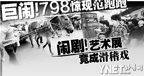 隨后,更多的“作品”給昨日的798平添了不少熱鬧——有趕馬車稱“驢子當(dāng)代藝術(shù)協(xié)會(huì)”的,有推小車賣尿壺稱“為人民服務(wù)”的,還有蒙上黑頭套逮誰(shuí)就問“誰(shuí)能告訴我?guī)谀膬骸钡摹@場(chǎng)面倒是響應(yīng)了雙年展此前提出的“人人都是藝術(shù)家”的口號(hào)。不過,記者從路邊一位不停抱怨的候補(bǔ)藝術(shù)家處得知,這些“創(chuàng)作”在開幕前的一刻都說不算數(shù)了,因?yàn)檫@個(gè)單元的策展人突然宣布退出雙年展,也就是說以上的現(xiàn)場(chǎng)行為表演都不再是雙年展的組成部分,而他本人是一位律師,本來(lái)準(zhǔn)備搞個(gè)現(xiàn)場(chǎng)法律咨詢,“這也是我的作品啊,但是現(xiàn)在不想實(shí)施了!
