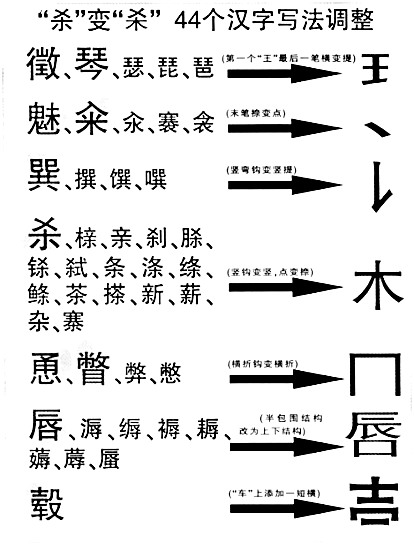 一些網(wǎng)友認(rèn)為,調(diào)整漢字如果只注重美感,就把傳統(tǒng)的東西丟掉了。比如“殺”字,本身下面像鉤像矛,有“殺氣”,下面改成“木”后,感覺(jué)就變了。專家解釋,這次調(diào)整字形有些地方參考了臺(tái)灣的字形。