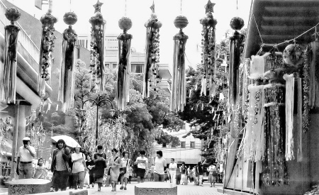 鳥住貞義先生還給我放了一段去年七夕時(shí),枚方市祭掃“七夕神社”的錄像,我看到,前往祭掃的人除了“七夕研究會(huì)”的成員外,還有當(dāng)?shù)氐淖h長、市府官員以及許多民眾。在“七夕神社”的周圍栽了很多竹子,前往祭掃的大人小孩都將自己的心愿寫在一張長紙條上,然后掛在竹子的枝條上,用來祈福。這使我想起日本小鈞市的“七夕文化”,也牽涉到兒童,“七夕”這天早上,凡年滿6歲的兒童在媽媽的陪同下,到野外的莊稼上取些露水回家,然后用露水磨墨寫字。這是一種儀式,代表兒童從這一天起,就開始啟蒙讀書寫字了。據(jù)我考證,這是日本和中國“七夕文化”略有不同的地方,其他如七夕夜放河燈,為牛郎與織女照明祝福;一家人在庭院里擺上桌子,沏上香茶,一邊品茶一邊觀看牛郎與織女相會(huì)天河的美景;在葡萄架下側(cè)耳傾聽牛郎與織女相會(huì)時(shí)的絮語;姑娘在絲瓜架下默默地向天上‘乞巧’,盼望自己能像織女那般心靈手巧,這些幾乎是相同的!跷/圖 湯禮春