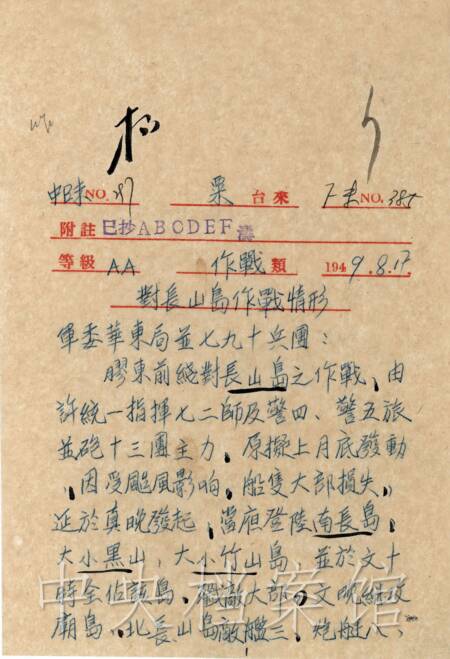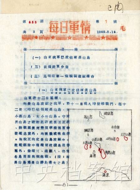 長山列島位于山東半島與遼東半島之間,扼渤海灣門戶,由南、北長山島等17個島嶼組成。山東半島解放后,退據(jù)長山列島的國民黨軍陸戰(zhàn)第2團等部,破壞漁業(yè)生產和海上交通,妄圖封鎖渤海灣。1949年8月,中國人民解放軍山東軍區(qū)指揮進行解放長山列島的作戰(zhàn)。11日晚,第24軍第72師和警備第4、第5旅分別從蓬萊縣劉家旺、欒家口、解宋營起渡。12日凌晨,警備第4、第5旅攻占長山列島兩翼大小黑山島、大小竹山島,牽制停泊在南北長山島的國民黨軍艦艇。第72師在友鄰配合下,接近南北長山島,并在炮火掩護下迅速登島,與國民黨守軍展開激戰(zhàn),上午攻占南長山島,下午占領北長山島。爾后以警備第5旅為主,向砣磯島、大小欽島、南北皇城島發(fā)展進攻。至20日,國民黨守軍殘部棄島逃遁,人民解放軍收復了國民黨軍隊占領的大小島嶼,殲國民黨軍15OO余人,山東省全境解放。
