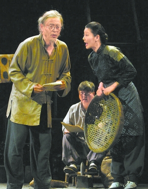 畢竟作者是初次染指舞臺(tái)劇,臺(tái)詞俏皮生動(dòng),人物個(gè)性鮮明,大段大段的“獨(dú)白”卻像是在寫小說(shuō)。小說(shuō)往往容許單管獨(dú)奏,或花開數(shù)朵各表一枝,戲劇除獨(dú)角戲外,必定是十指彈琴,彼此呼應(yīng)。幸虧何冰是一位壓得住臺(tái)的優(yōu)秀演員,那熱力四射的情感深度與舞臺(tái)張力,將大段大段的臺(tái)詞化成旁若無(wú)人的心靈傾訴,挽救了眾人臺(tái)詞空白的尷尬。也幸虧導(dǎo)演林兆華故意犯禁的巧妙處理,以群體角色靜默不動(dòng)或極少動(dòng)作,反襯苑大頭的情感井噴;以表現(xiàn)性的非現(xiàn)實(shí)場(chǎng)面,處理這一反常的劇作和生活情態(tài),出乎意表地使第三幕后段反而成為全劇最具特色的舞臺(tái)處理,從而使寫實(shí)與非寫實(shí)的界限變得模糊,或者說(shuō)開拓了寫實(shí)主義戲劇更為寬闊的表現(xiàn)空間。 (林克歡)