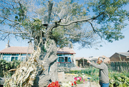 記者轉(zhuǎn)頭望去,金色的陽光灑滿綠色的庭院,庭院中央,一棵四人合抱的大槐樹矗立著,盡管近一半的樹干被燒毀,但另一半仍然枝繁葉茂,給庭院提供一片滋潤的樹陰。那位村民說,這棵神樹遭雷劈過,不過,神樹數(shù)次逢兇化吉。