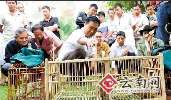 在勐捧農(nóng)場場部,很多膠工和附近的村民在凌晨割完橡膠后,就提起自己的愛鳥,匆匆趕到鳥市來遛鳥,至上午10點左右,又匆匆離開鳥市返回膠林收膠。但更多的人卻沉浸在鳥市之中,各自將鳥籠的活動門與大鳥籠對接后,兩只躍躍欲試的畫眉鳥就會進入大鳥籠一決雌雄。兩只小鳥在籠中紅著眼睛望著對方,振翅或用嘴啄、或揮爪攻,各使絕技展開肉搏,一旦不敵對方后退,勝利一方也由于有隔離欄而無法隨興趕盡殺絕。這時,心疼自己愛鳥的主人一般只需將活動門關(guān)上,兩只廝殺完畢的小鳥就會各自回到自己的籠中。