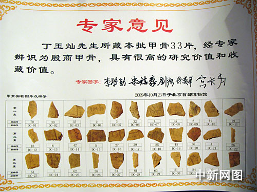 在本次論壇上,廈門當代置業(yè)集團副總裁、廈門復文美術館副館長、福建海泉蘭花實業(yè)有限公司董事長丁玉燦,將個人繼承、收藏的,經現場專家組“辨識為殷商甲骨,具有很高的研究價值和收藏價值”的三十三片甲骨,無償地捐贈給南靖縣人民政府永久收藏。