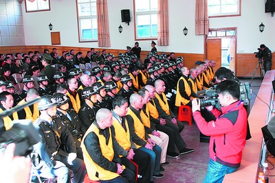 8時(shí)30分,庭審正式開(kāi)始。宣布完法庭紀(jì)律后,審判長(zhǎng)一聲令下:“傳被告人到庭!”緊接著,27名身著橘色背心的被告人被帶上法庭。被告人在魚(yú)貫而入時(shí),均不時(shí)向旁聽(tīng)席上張望,而旁聽(tīng)席上也傳來(lái)一陣細(xì)細(xì)的抽泣聲。