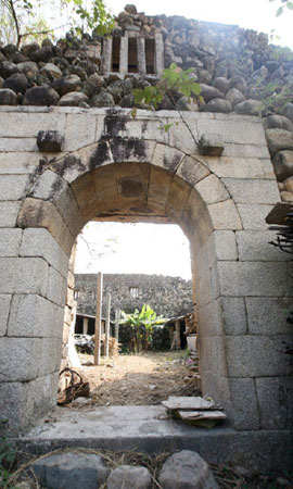 石堡是一個(gè)長方形建筑,長37米、寬31米,墻體內(nèi)外全是用鵝卵石及條石砌成,歷經(jīng)數(shù)百年風(fēng)雨,雖說已經(jīng)沒有了屋頂,只留下高約8米的墻基,但依然雄偉屹立。石堡的三面是護(hù)厝房,外墻也是石頭,但內(nèi)墻是由土夯成的,非常牢固,石堡大門上陰刻“懷珠”兩字。