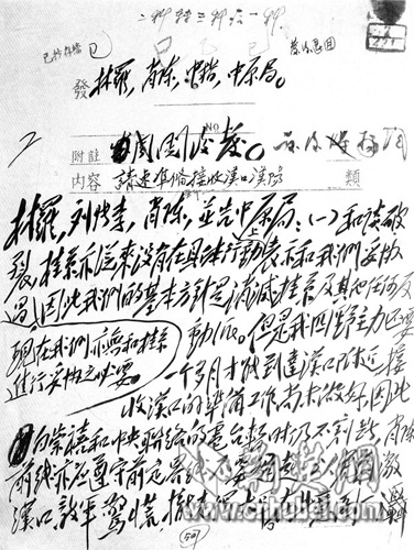 武漢是1949年5月解放的,但從此次披露的電報(bào)手稿影印件來看,早在2月12日,毛澤東即為中央軍委起草了給四野司令員林彪、政委羅榮桓等人的電報(bào),命令四野先出兩個(gè)軍迫近漢口鉗制白崇禧部,使其不能向東增援以妨礙中野、華野渡江。3月17日又電令四野主力應(yīng)于4月1日前完成出發(fā)準(zhǔn)備。