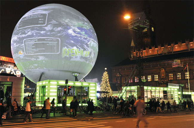 12 月7 日,記者抵達(dá)哥本哈根。據(jù)說,有大約1200 輛豪華汽車、140 架私人飛機(jī)以及數(shù)萬人涌入哥本哈根,為此,丹麥政府不得不為會(huì)議購(gòu)買價(jià)值60 萬歐元的“碳積分”。中國(guó)和美國(guó)成為會(huì)場(chǎng)里最受關(guān)注的焦點(diǎn)。而在會(huì)場(chǎng)外,到處可見環(huán)保人士的環(huán)保秀,來自小島國(guó)代表的示威抗議也此起彼伏。此時(shí),受人矚目的哥本哈根變成了一個(gè)環(huán)!按笮銏(chǎng)”。