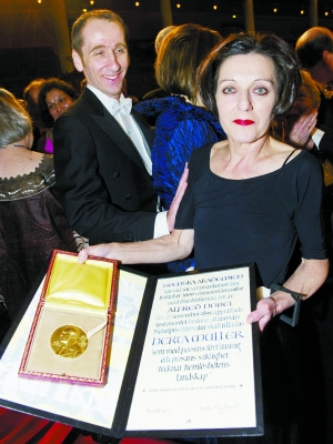 當(dāng)赫塔·穆勒從瑞典國王手中接過裝有獎?wù)潞妥C書的紅色小皮匣后,遵照儀式禮節(jié)先后向皇家成員、瑞典皇家學(xué)院院士和觀眾席深深鞠躬以示感謝時,掌聲經(jīng)久不息。