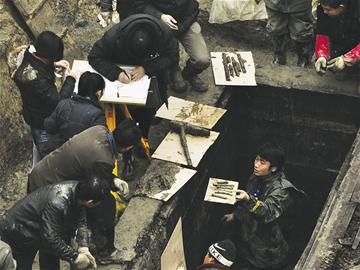 昨日上午10時許,工作人員從槨室內(nèi)的淤泥中清理出幾片器物,吸引了眾人的目光。經(jīng)現(xiàn)場考古專家證實,這是兩枚珍貴的竹簡,由于年代久遠(yuǎn),墓室內(nèi)的結(jié)構(gòu)和環(huán)境又遭破壞,竹簡異常脆弱。工作人員隨即將竹簡嚴(yán)密包裹起來。由于槨室內(nèi)的淤泥和積水較多,竹簡的數(shù)量和簡上文字內(nèi)容尚不得而知。