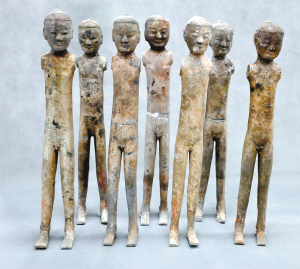 “這些陶俑與漢陽陵的陶俑相似,大約60厘米高!睆堉倭⒄f,現在雖然看著陶俑都是赤身裸體,沒有胳膊,但在胳膊處都留有孔,而在坑內專家們還發(fā)現了盔甲的殘片,可見這些陶俑原先都穿有各種各樣的衣服。而在坑內,出土了大量的兵器銅鏃、刀、箭等,還有十分少見的6金6銅的青銅鐘,還有做飯用的陶釜。