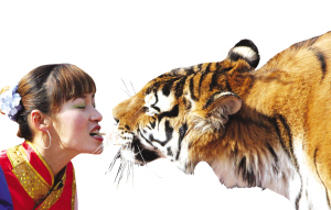 晁改敏被蘇州人熟悉,是在去年11月。那時,她所在的馬戲團(tuán)與蘇州白象灣景區(qū)正式簽約,她和丈夫也告別了各地流動演出的生活,帶著英雄虎爸虎媽和它們的兩只虎寶寶,在蘇州暫時定居。白象灣景區(qū)開園的時候,晁改敏表演了叼肉喂虎節(jié)目,此前她曾因此節(jié)目,被譽為中國第一馴虎女郎。當(dāng)她叼著肉,老虎從她的嘴邊把肉吞下時,她的口與虎口近乎零距離。此后,游人多的時候,晁改敏總會表演這一節(jié)目,晁改敏也因此在蘇州名氣響亮。