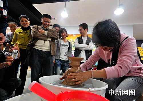 制作現場上,優(yōu)美動聽的古箏樂曲不停地繚繞盈耳,瓷藝家們或捏或雕,或刻或鏤,或推或接,各種傳統(tǒng)技法紛紛上陣,精彩紛呈。這行云流水般的手法、精妙細致的做工、別出心裁的設計,讓參觀者看得眼花繚亂,贊嘆不已,為之折服。人們忍不住上前摸一摸細膩的瓷泥,轉一轉工作盤,拿一拿精致的制作工具。前來參觀的顏小姐不禁挽起袖子也親身體驗了一回手拉坯。在轉盤的帶動下,顏小姐雙手輕拉瓷泥,那團柔軟的瓷泥仿佛有了靈性一般“舞蹈”起來,一會變成一個款嘴的大海碗,一會又變成一個細腰的小花瓶。舉著滿手的瓷泥,顏小姐開心地說:“太有意思了,讓我想起小時候玩泥巴的情景。”她還表示:“下次有空的時候,我一定還要再來玩手拉坯,DIY一件作品做紀念。”