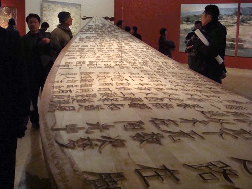 中國美術(shù)館的7號展廳中央圍了層層的觀眾,觀眾的包圍圈中是一艘甲板上刻滿漢字的木船,船的形狀好像一片樹葉,船體流暢的線條有搖曳之感,加上船頭的琴拴設計,俯視船身正面又好像一把古老的中國樂器。