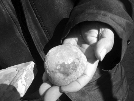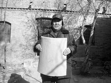 記者在龍振山處不但見到大如饅頭的“門釘”,而且還看到他在西高穴收集的大如簸箕的瓦片,長與下寬足有50多厘米,龍振山持于身前,遮蓋了半個身子。