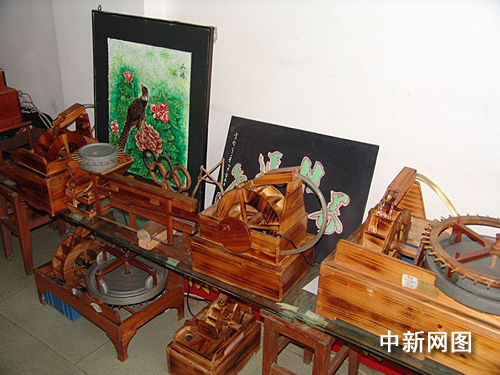 涂祖奕介紹,這些“活寶”名為“水驅(qū)仿古飾物”,是他經(jīng)多年時(shí)間,在繼承中國(guó)傳統(tǒng)農(nóng)業(yè)水利設(shè)施精華的基礎(chǔ)上,匠心獨(dú)運(yùn),按照一定的比例微縮精做而成,有微型水碓、水磨、輪碾、水鋸等5個(gè)系列40多個(gè)品種,均已獲國(guó)家專利證書(shū)。