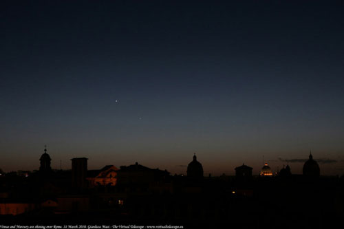 據(jù)美國太空網(wǎng)報道,近日,一名意大利天文學家拍攝到罕見的天象照片:水星和金星同時在羅馬的夜空閃耀。