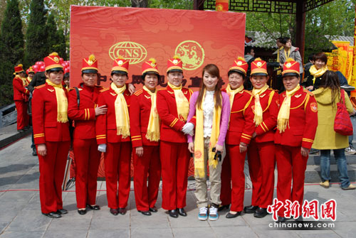 大典進(jìn)行時(shí),各項(xiàng)準(zhǔn)備工作就緒,拜祖場(chǎng)務(wù)人員在拜祖現(xiàn)場(chǎng)等候各項(xiàng)議程的工作安排,他們“忙里偷閑”和中新網(wǎng)直播主持人合影留念。參加放飛和平鴿的兩岸四地的小朋友們靜靜坐在亭子里等候。