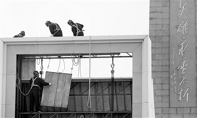 上午8時許,記者在人民英雄紀念碑前看到,工人正在組裝放置孫中山先生畫像的背板相框,并且將相框整體加固。