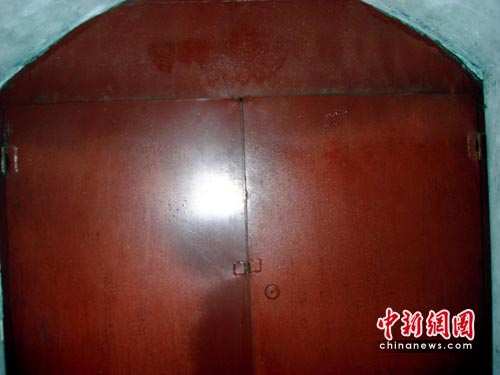 日前,記者聽說少林寺在建造一座地宮,便前往一探究竟。這座傳說的人造地宮,位于塔林西側(cè)約50米處,門口由青石砌成。地宮的石門不大,高約1米,寬約0.8米,被一把銅鎖鎖住。通過石門約5公分的門縫往里看,只能看到里面漆黑一片。當(dāng)記者用卡片相機(jī)伸進(jìn)石門門縫拍攝時,里面又是一扇紅色的鐵門,右側(cè)的墻壁上還安裝有電源開關(guān)。