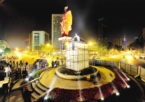 22:30,淮海路、洪武路、王府大街、長(zhǎng)江路組成的新街口四環(huán)實(shí)施交通管制,新街口大轉(zhuǎn)盤(pán)馬上“清凈”下來(lái)。22:35,工作人員開(kāi)始做吊裝前的準(zhǔn)備工作,首先是兩臺(tái)吊裝機(jī)駛近大轉(zhuǎn)盤(pán)南北向停放,緊接著工作人員將銅像下的原有基座切割掉后,吊機(jī)開(kāi)始起吊銅像,為了平衡銅像,在銅像的四邊,都有人用繩子進(jìn)行牽拉,大約23:50銅像吊裝到基座上,工人開(kāi)始對(duì)銅像進(jìn)行固定……截至記者發(fā)稿時(shí),銅像仍在安放中。