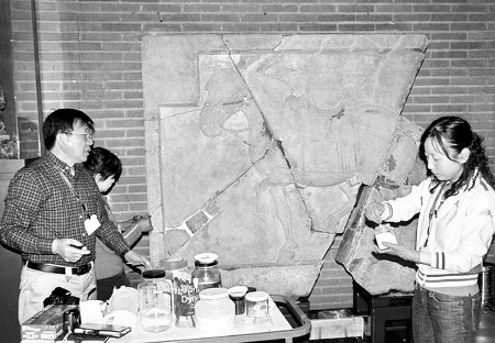 來自陜西唐大明宮遺址文物保護基金會的赴美代表和隨團記者以及美方專家,共同見證了這一時刻。據(jù)西安專家組組長楊文宗介紹:今天主要進行的是補全工作,補全是文物修復(fù)工作中比較重要的環(huán)節(jié),在上一周及前期在國內(nèi)大量實驗工作的基礎(chǔ)上,終于開始了補全工作的實施。前期試驗段主要包括修補材料的選擇、采用工藝的確定等工作,待實驗結(jié)束后,中美雙方專家就實施方案進行了最終的敲定。今天的補全工作首先是使用加固劑對斷面進行加固,其次是調(diào)制修補用的填補材料。今日開始,修補的部位主要為拳毛騧表面橫向出現(xiàn)的3條裂縫,約3.5米,颯露紫右下角、拳毛騧左下中部、左側(cè)面等幾處缺失做了填充修補。
