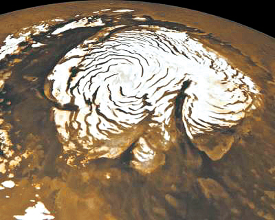 火星北極冰冠(蓋)有兩個(gè)奇異的特征,即存在著一條規(guī)模勝過大峽谷的深谷和一系列的螺旋形低谷。人們發(fā)現(xiàn)這兩個(gè)特征40年來,始終沒有能準(zhǔn)確地解釋它們形成的原因。不過這已經(jīng)成為過去,美國(guó)科學(xué)家表示,他們成功地再現(xiàn)了火星北極冰冠兩特征形成過程,從而解開了困擾人們多年的謎團(tuán)。