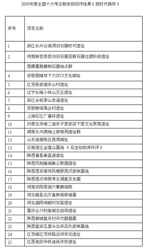 據(jù)介紹,今年的初評(píng)由國(guó)家文物局考古專(zhuān)家組成員、中國(guó)考古學(xué)會(huì)104位理事和63家全國(guó)考古發(fā)掘資質(zhì)單位共同投票,從60項(xiàng)候選項(xiàng)目中按得票數(shù)產(chǎn)生25個(gè)發(fā)掘項(xiàng)目入圍(名單附后),參加2009年度全國(guó)十大考古新發(fā)現(xiàn)終評(píng)評(píng)選。