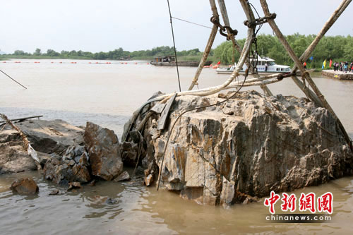 中新網鎮(zhèn)江6月4日電(趙國財 唐娟)4日下午,首塊《瘞鶴銘》摩崖石刻疑似殘石被巨型“勇士號”浮吊船吊起約半米后發(fā)生碎裂,首次起吊被迫終止。在打撈人員下水清理碎石后,傳來最新消息!动廁Q銘》打撈項目現(xiàn)場總指揮王雷介紹,碎裂的石頭不會對其他三塊預備打撈的石頭造成損壞。相較于首塊殘石,他更寄希望于壓在該石下面的殘石。他表示,爭取一周后展開第二次打撈。