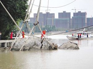 鎮(zhèn)江文廣新局副局長(zhǎng)孫小梅表示,在打撈預(yù)案中已有巨石破裂的預(yù)案,并且打撈方認(rèn)為這種可能性超過50%,因?yàn)榫奘菑慕股巾斏纤ぢ渲两械氖w早已受損;加上多年的風(fēng)化、江水長(zhǎng)期浸泡,使得石體出現(xiàn)質(zhì)變。打撈只不過將巨石的隱性傷痕變?yōu)轱@性。