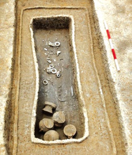 據(jù)介紹,今年3月初,浙江省文物考古研究所和余杭博物館聯(lián)合對玉架山遺址繼續(xù)進(jìn)行發(fā)掘、探索。本年度發(fā)掘至今,清理良渚文化墓葬32座(共200座);可能存在房址的東北角附近已著手發(fā)掘。依照計劃尋找遺址對外通道,解剖了環(huán)壕東北角向北延伸的部分(鉆探時推測為北通道),獲知解剖點的北通道寬約9.5米,深1.5米。在距北通道西側(cè)約30米處發(fā)現(xiàn)了另一小遺址,清理了一條東西向小溝(局部),在小溝的北岸壘有一些石塊,并發(fā)現(xiàn)了良渚文化晚期小墓墓地,暫時清理了其中一座。
