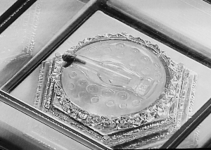 圣物供奉在全國工藝大師王殿祥親手設(shè)計(jì)制作的楠木刻金寶座上。這兩套楠木刻金寶座直徑有15厘米,高度為12.5厘米,寶座底座和下三層都是浮雕,圖案主要是一些蓮花等佛教紋飾,上面三層是蓮花花瓣。最上面一層采用圓雕手法“綻放”出朵朵蓮花。兩個(gè)寶座采用楠木雕刻,貼附金箔,寶座金光熠熠,莊重而華貴。