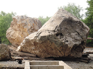 或許是巨石過(guò)于沉重,巨石下墊放的粗壯枕木有的都被壓斷,平臺(tái)面上還被砸出大小不等的坑,可見(jiàn)巨石落地時(shí)的巨大壓力。四塊巨石相鄰而放,在最小的一塊石頭上,還留有一根纜繩,足有成人手臂粗。焦山碑林碑刻博物館館長(zhǎng)丁超告訴記者,四塊巨石的出水時(shí)間分別在10日、15日和19日三天。盡管4日打撈一塊巨石出水時(shí)出現(xiàn)碎裂,但經(jīng)專家們分析后,還是決定按照原計(jì)劃打撈,即通過(guò)潛水江底沖淤后給巨石穿高強(qiáng)度尼龍纜繩起吊。