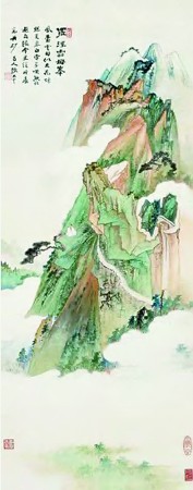 這套《山水二十八條屏》以設(shè)色居多,筆墨酣暢,意境深邃。每畫必題,書體多樣,有大千體、石濤體,還有隸書、篆書。張大千寫大千體或石濤體不乏有之,但張大千寫隸書,尤其寫篆書則屬罕見!渡剿藯l屏》有臨仿,如仿吳鎮(zhèn)、石濤、漸江;有寫生,如《羅浮云母峰》、《羅浮鳳凰谷圖》,多數(shù)為創(chuàng)作。二十八屏懸掛于墻壁,場(chǎng)面之浩大,氣勢(shì)之恢弘,極具震撼力。