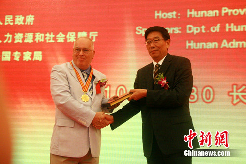 中新網(wǎng)長沙9月30日電(劉柱 華城)30日,湖南省第五屆“瀟湘友誼獎(jiǎng)”頒獎(jiǎng)儀式暨外國專家國慶招待會(huì)在長沙舉行,來自世界13個(gè)國家的20位專家榮獲“瀟湘友誼獎(jiǎng)”。湖南省省長徐守盛致辭并親自為獲獎(jiǎng)專家頒獎(jiǎng)。