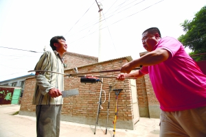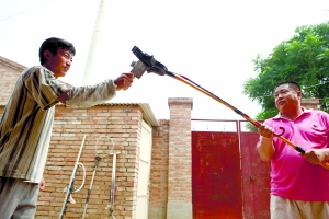 吸刀器、鎖喉器、捕捉器、自救器,昨日,北京八中的萬能工(什么活都能干的工人)齊海軍在通州古城村的自家門前,演示起他發(fā)明的校園安保“四件套”。