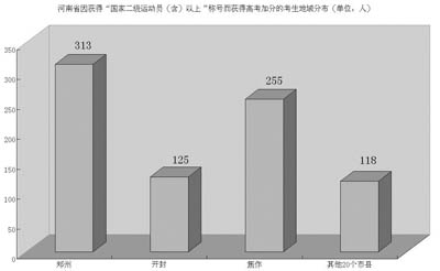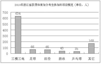統(tǒng)計(jì)還發(fā)現(xiàn),田徑、籃球、足球三項(xiàng)加分考生在各地市分布比較平均,而健美操、無線電測向和定向越野卻集中在成都、綿陽和南充3市,共為500人,占這三項(xiàng)加分總?cè)藬?shù)的78%。