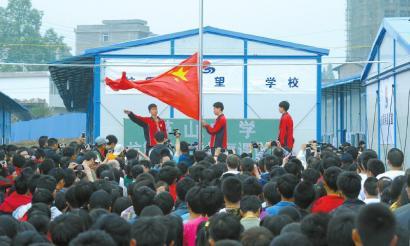 昨日上午10時許,復(fù)課儀式在蘆山中學操場上舉行。唱國歌、升國旗、宣布復(fù)課……1500余名蘆山中學高一、高二年級師生,近百名志愿者,希望工程捐贈方代表……所有的空地都被人群占滿。