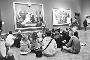 和中國的情況不同,歐美國家的中小學生則把去美術館視為平常之事,西方人從小就有定期參觀美術館、博物館等公共文化空間的習慣,而歐美國家的美術館、博物館也把為孩子服務看作最重要的工作之一。記者曾先后去過法國、英國采訪,發(fā)現(xiàn)無論是法國的盧浮宮、大皇宮國家美術館,還是英國的大英博物館、國家畫廊,到處都可以看到孩子的身影,而且不少是由學校組織帶隊參觀,甚至還有一些老師直接在美術館里為學生上課。