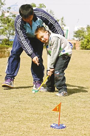 “我揮了半天,終于進洞了!10名二年級的小學生正在體育教師李科的帶領(lǐng)下進行高爾夫球訓練。這些孩子拿的高爾夫球桿是一根大約長30厘米的塑料桿,另外還有15個紅、藍色球洞分置在草坪四周。