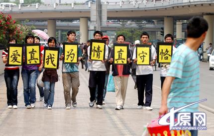 昨日上午,幾個來自中原工學(xué)院的大學(xué)生舉著“恪守真情為我真愛”的牌子出現(xiàn)在紫荊山廣場附近,他們選擇年輕人,特別是年輕情侶密集的地方活動,并請求他們在自己準備好的橫幅上簽名,支持自己“把第一次留給自己最愛的人”的觀點。