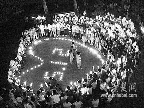 宿舍樓下,燭光組成大大的愛心和“5.12”字樣;500余名學(xué)生手捧蠟燭,為罹難同胞祈禱。前日晚,武漢工程大學(xué)武昌校區(qū)的一場(chǎng)畢業(yè)聚會(huì),顯得如此凝重。