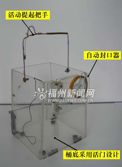 每次倒垃圾,都要先把垃圾從桶提出來,用手捆扎好后再丟棄。與垃圾的親密接觸以及垃圾袋的膨脹破裂,成了人們生活中難以避免的尷尬。福州教育學院的李昂同學發(fā)明了一種能自動封口,并從底部卸走垃圾袋的垃圾桶,巧妙地解決了倒垃圾的尷尬。