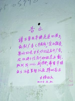“請(qǐng)不要在本樓走道墻上亂刻廣告(牛皮癬)……如故意再刻,抓到罰100元,刷墻面!痹诙䲢l巷小區(qū)41號(hào)4單元一樓,記者看到了這樣的告示,貼在一面剛剛被重新粉刷過的墻上。爬上二樓樓道,這面墻也留著剛剛被粉刷過的痕跡,黑體大字書寫的“告示”格外醒目。