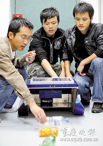 “我們發(fā)明的機(jī)器人會(huì)撿礦泉水瓶和塑料袋,還會(huì)掃地……我們將把它作為畢業(yè)紀(jì)念品送給學(xué)校!弊蛉(10月29日),重慶交通大學(xué)機(jī)電與汽車(chē)工程學(xué)院的大四學(xué)生胡偉平、謝敬濤、王定坤等五位同學(xué)將發(fā)明的“保潔機(jī)器人”贈(zèng)送學(xué)校,作為回報(bào)母校的禮物。