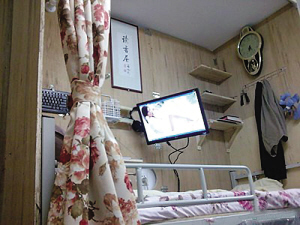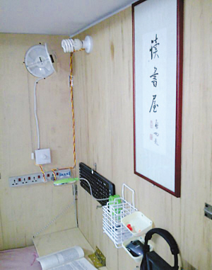 從論壇發(fā)布的照片上可以看到,三張木板及花色窗簾構(gòu)造了一個(gè)豐富的私人空間(圖一)。內(nèi)有照明、電腦及空氣循環(huán)設(shè)備,可伸縮的電腦屏幕和可隨時(shí)收合的寫字臺(tái),鍵盤、鼠標(biāo)和耳機(jī)掛在墻上(圖二),使用的時(shí)候只要旋動(dòng)一個(gè)旋鈕,東西就可以拿下來(lái)在任何地點(diǎn)使用。這個(gè)狹小的空間內(nèi)還有三層木架,可放生活用品(圖三)。最吸引人注目的是該男生還在床頭掛了一幅墨寶——“讀書屋”。給人的總體感覺(jué)是,這是一個(gè)富有創(chuàng)意又勤奮好學(xué)的學(xué)生。