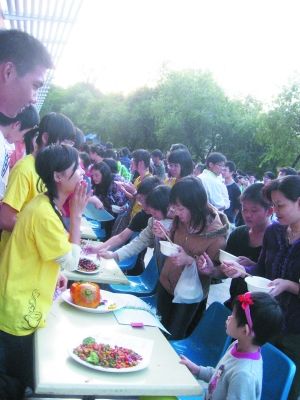 現(xiàn)場(chǎng)烹飪比賽結(jié)束后,各參賽隊(duì)伍把自己的成品展示在一排長(zhǎng)長(zhǎng)的桌子上。現(xiàn)場(chǎng)學(xué)生排起了數(shù)十米長(zhǎng)的隊(duì)伍,人手一只碗,一雙筷,擺好陣勢(shì)沖著美食長(zhǎng)龍開(kāi)始了“掃蕩”。“七里飄香”雞翅,“盛世金蘭”南瓜煲......各位學(xué)生大廚一邊介紹一邊拉票,場(chǎng)面熱鬧非凡。 (記者 薛冰 實(shí)習(xí)生 林珍 通訊員 何淑賢)