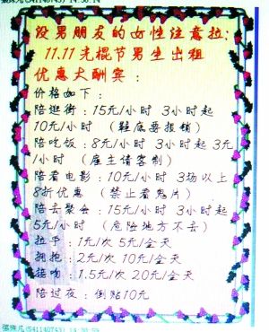 在這個(gè)特別的節(jié)日,更驚人的是,在各大高校BBS上,竟廣泛轉(zhuǎn)載著一條男生“出租”自己給女生一天的帖子,內(nèi)容包括陪逛街、吃飯、看電影及各種身體接觸的收費(fèi)標(biāo)準(zhǔn),服務(wù)時(shí)間長(zhǎng)還可以打折。