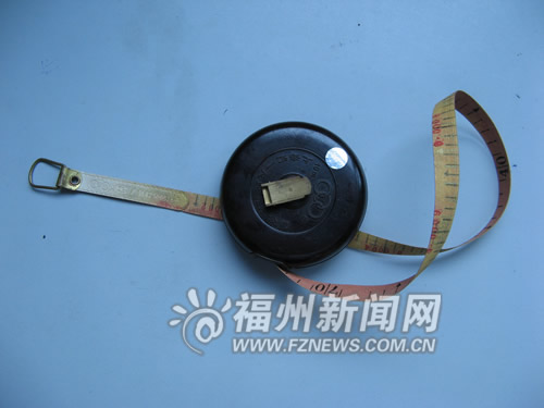 這尺為皮帶型的布帶尺,全長(zhǎng)50米。尺的正面為黃色,刻度為米,稱為黃尺;背面為紅色,刻度為“毫”,稱為紅尺。